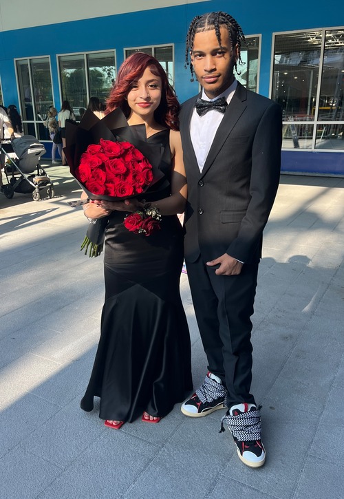 We are awarding the title of best dressed to Xiomar Menendez and his date, Gabriella Cruz, who carried a stunning bouquet of red roses. Menendez wore a special pair of sneakers called Lavin.